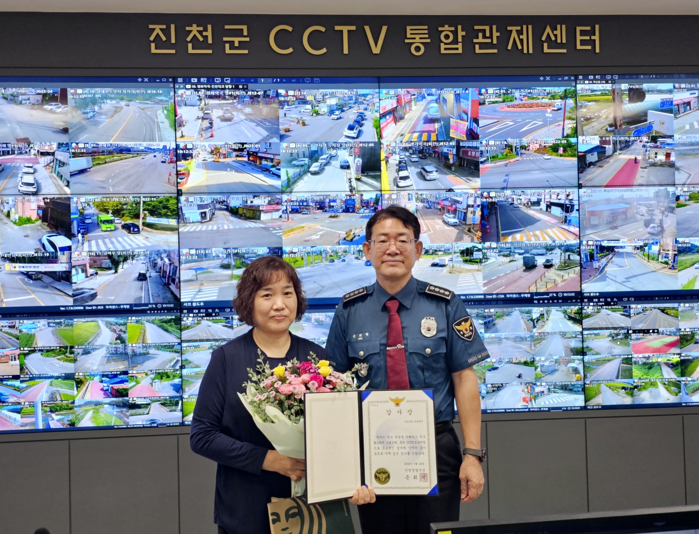 ÁøÃµ°æÂû¼(¼Àå ¼ÕÈÖÅÃ)´Â 9¿ù22ÀÏ ÁøÃµ±º CCTV ÅëÇÕ°üÁ¦¼¾ÅÍ¿¡¼ Ư¼öÀýµµ ÇÇÀÇÀÚ °Ë°Å¿¡ ±â¿©ÇÑ °üÁ¦¿ä¿ø¿¡°Ô °¨»çÀåÀ» Àü´ÞÇß´Ù.