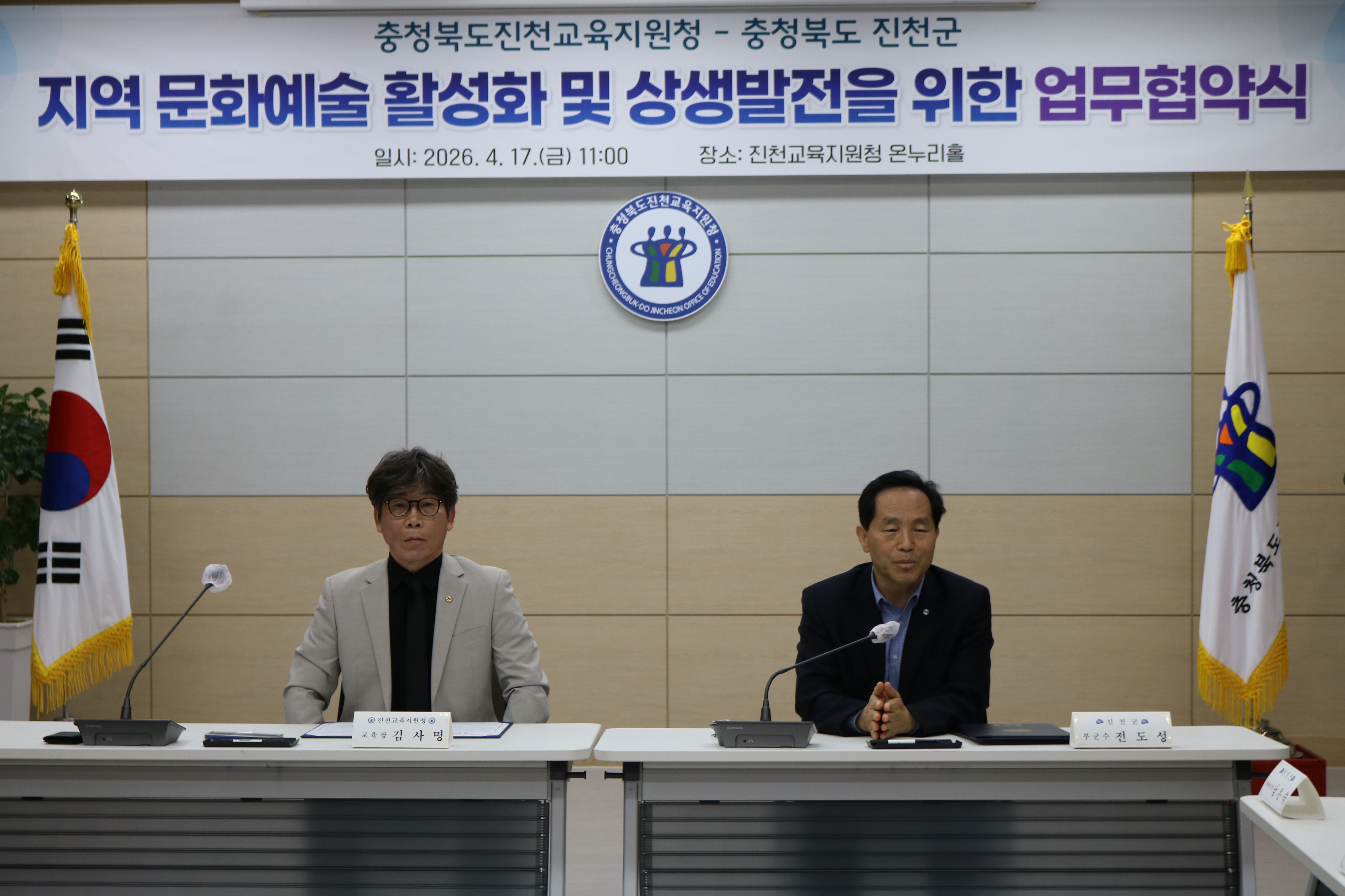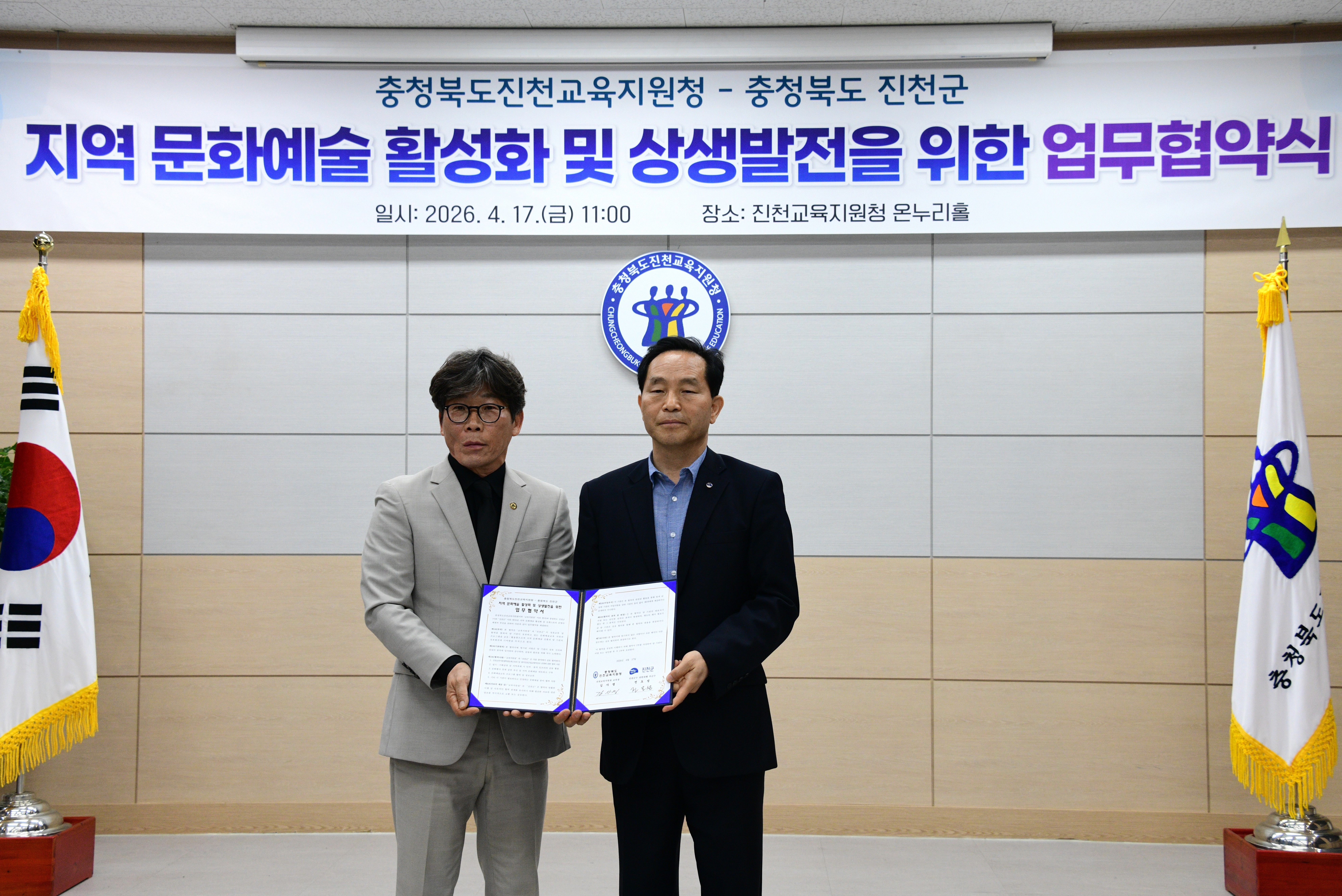 ÃæÃ»ºÏµµÁøÃµ±³À°Áö¿øÃ»(±³À°Àå ±è»ç¸í)°ú ÁøÃµ±º(±º¼ö ±ÇÇÑ´ëÇà ºÎ±º¼ö Àüµµ¼º)Àº 4¿ù 17ÀÏ Áö¿ª ¹®È¿¹¼ú Ȱ¼ºÈ ¹× »ó»ý¹ßÀüÀ» À§ÇÑ ¾÷¹«Çù¾à(MOU)À» ü°áÇß´Ù.